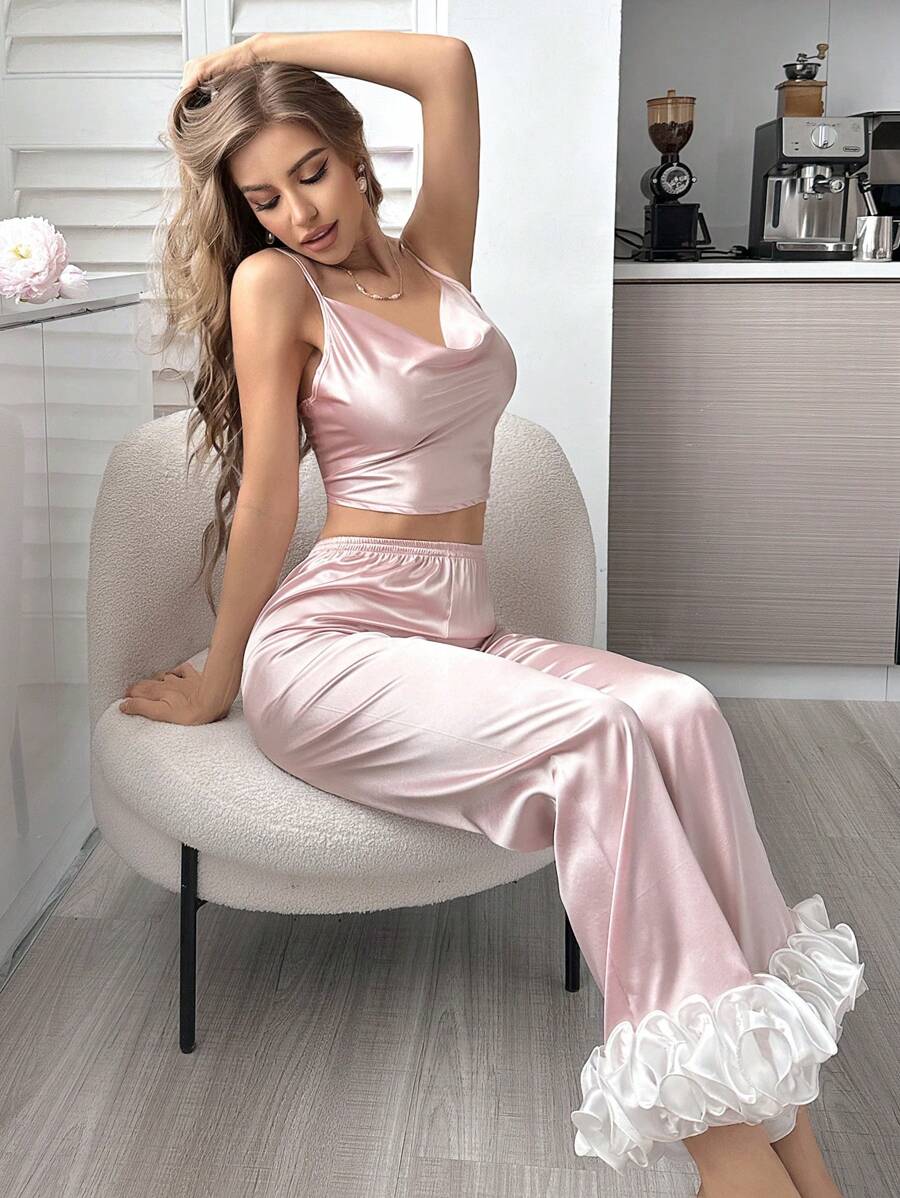 طقم بيجامة راقٍ بتصميم زهرة ثلاثية الأبعاد وحزام حريري مُجدول، يتكون من كامي بلا أكمام وبنطال طويل