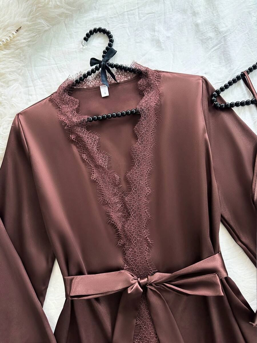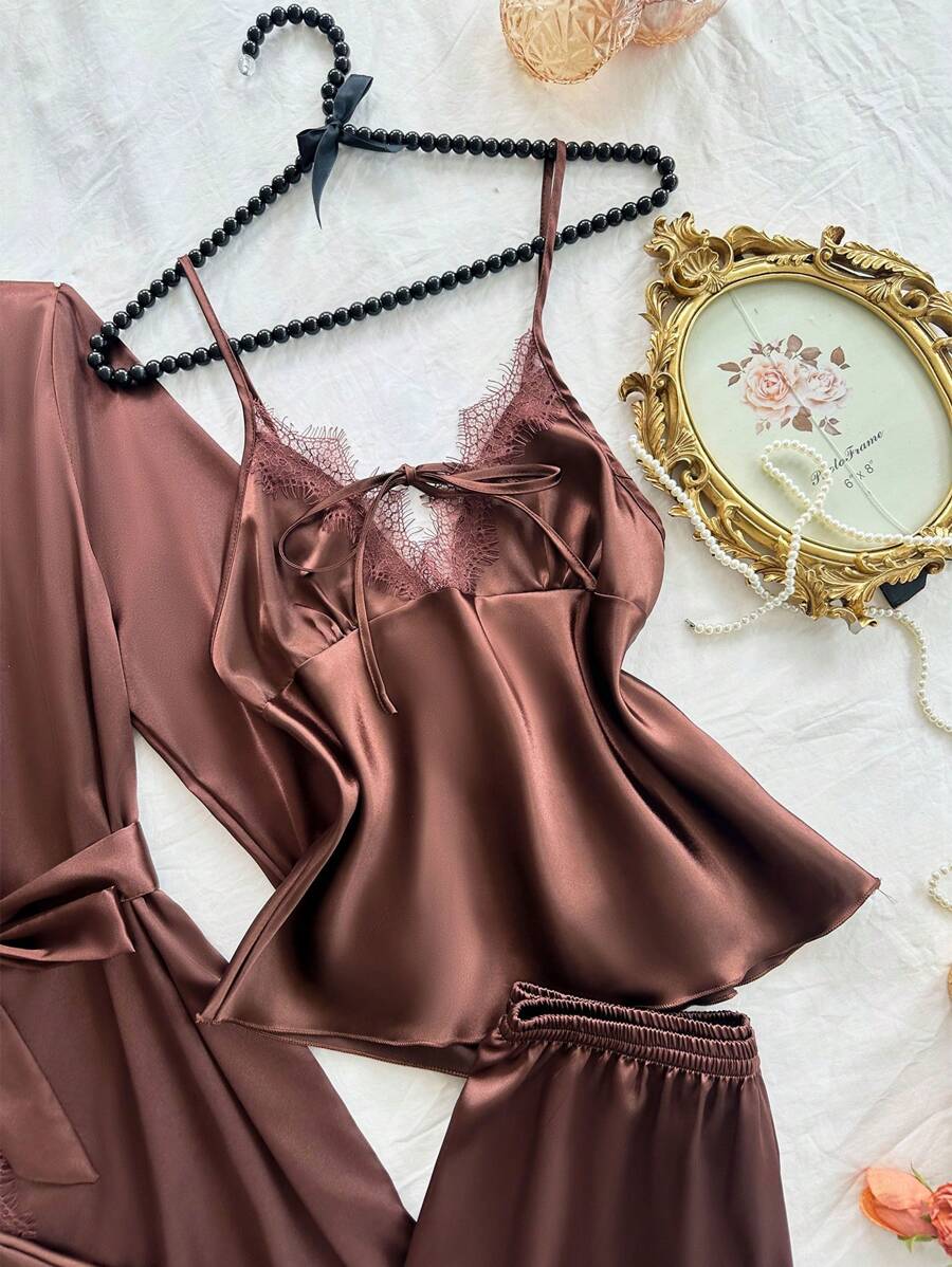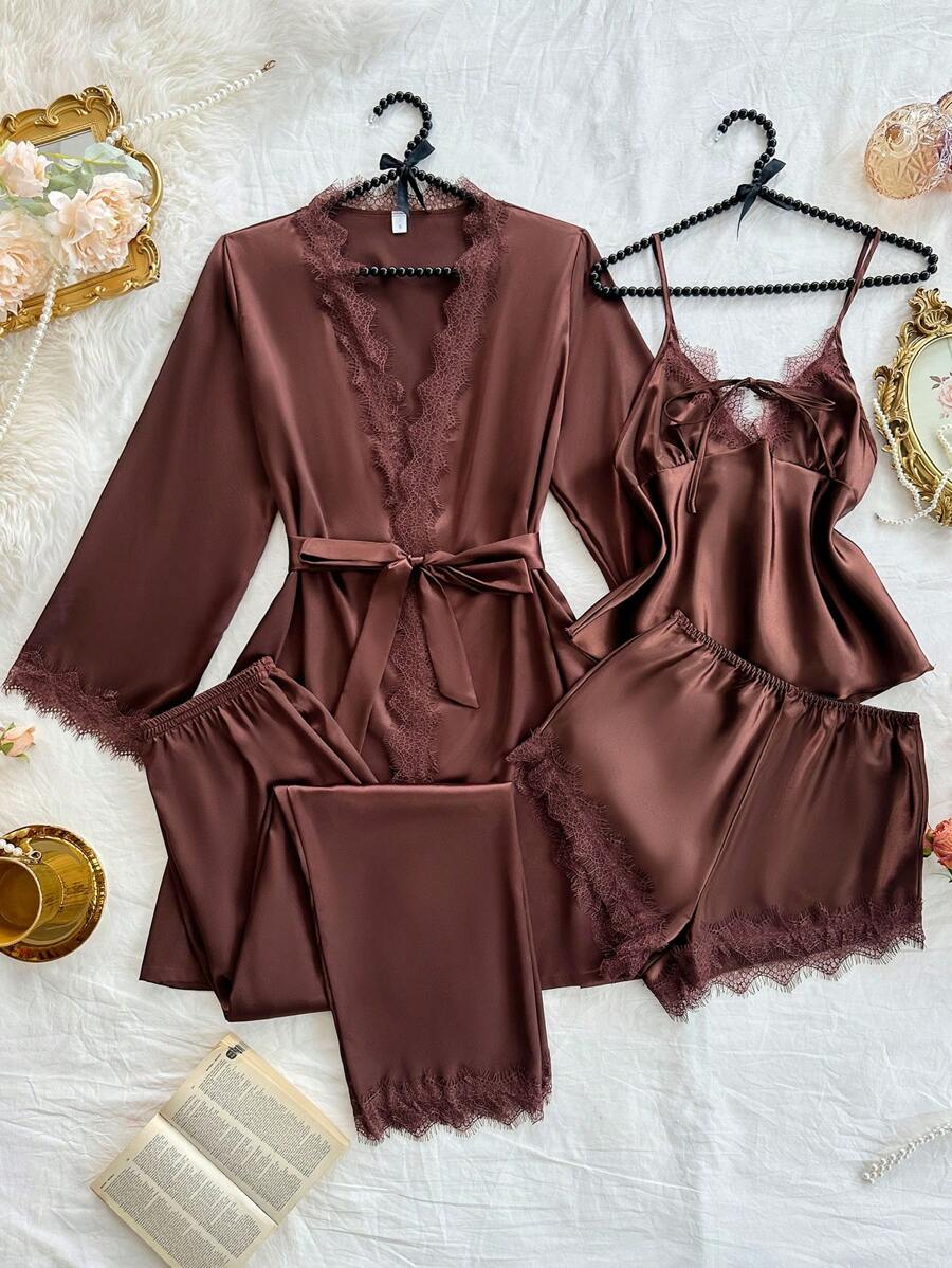 ☕✨ SilkySpell مجموعة بيجامات نسائية 4 قطع بني داكن