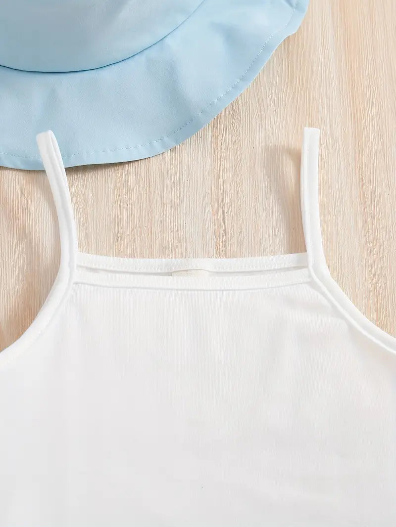 Girl's 4pcs Vest & Camisole & Hat & Elastic Waist Skirt Set, Butterfly Mesh Decor Cute Trendy Outfits, Kids Clothes For Summer