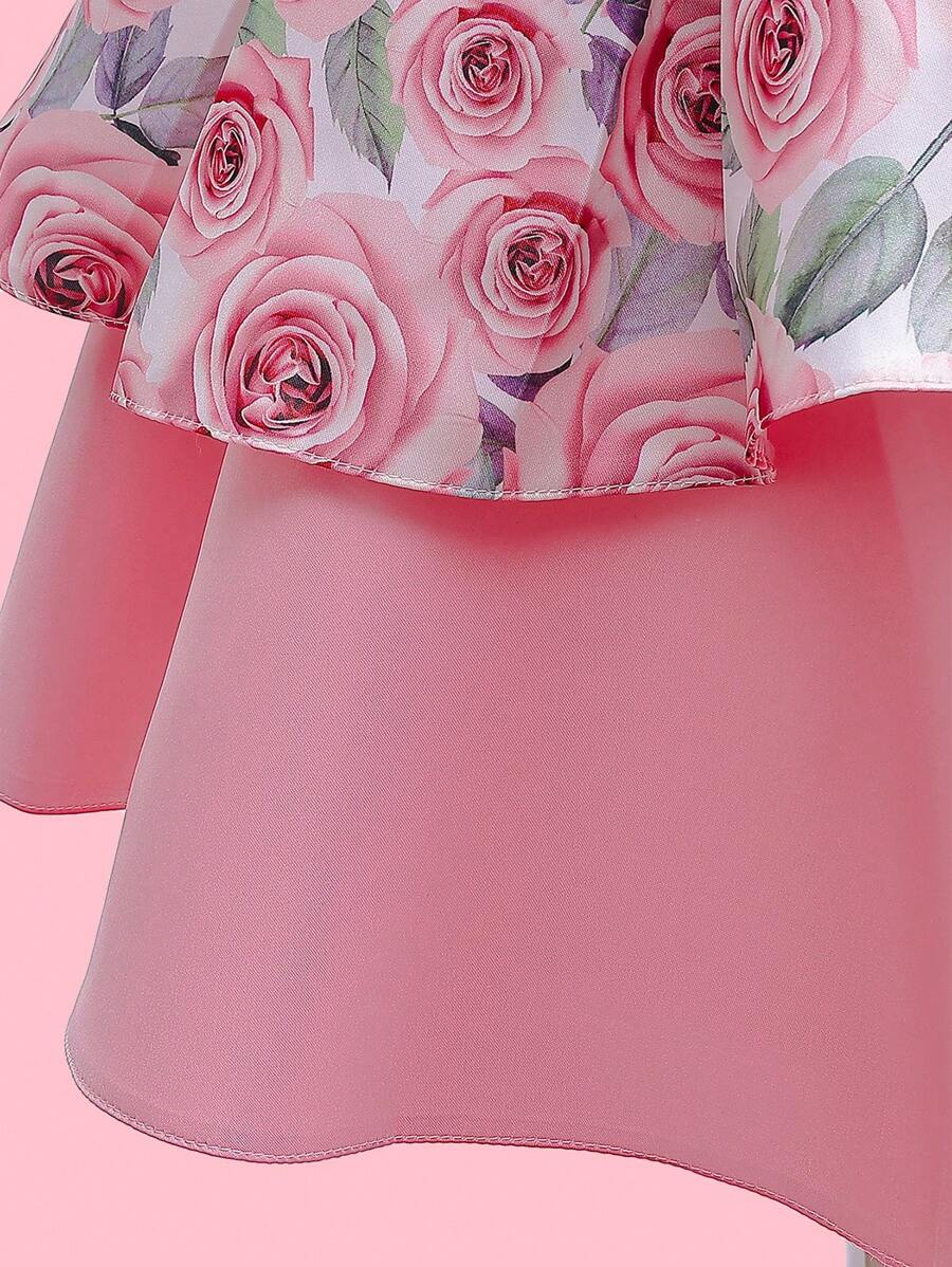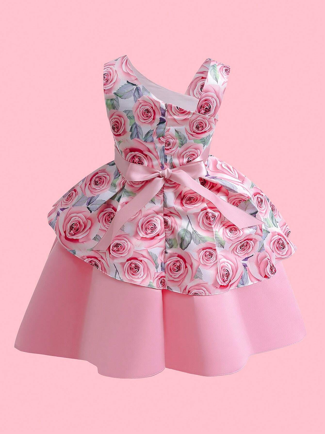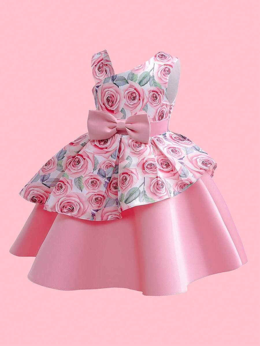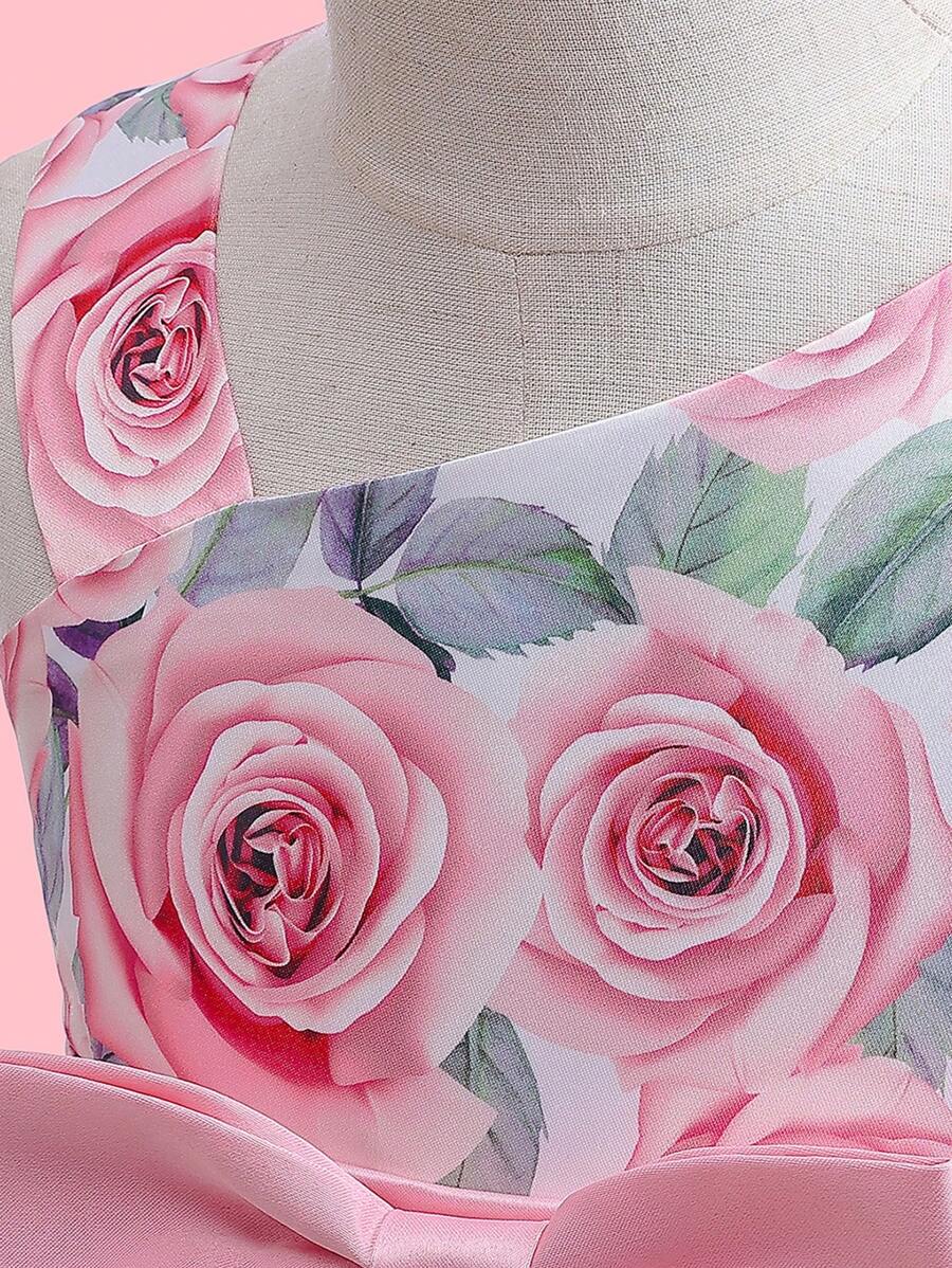 Girls Sleeveless Rose Flower Graphic Bow Princess Dress Gown Piano Performance Dress