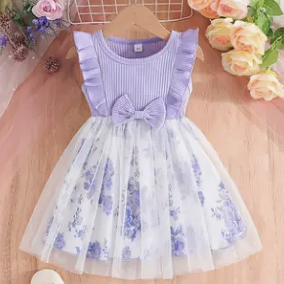 Summer Baby Girls Kids New Cute Bow Pit Strip Splicing Flower Print Dress