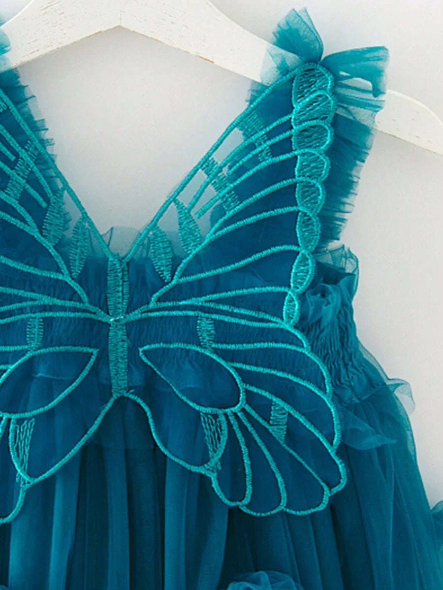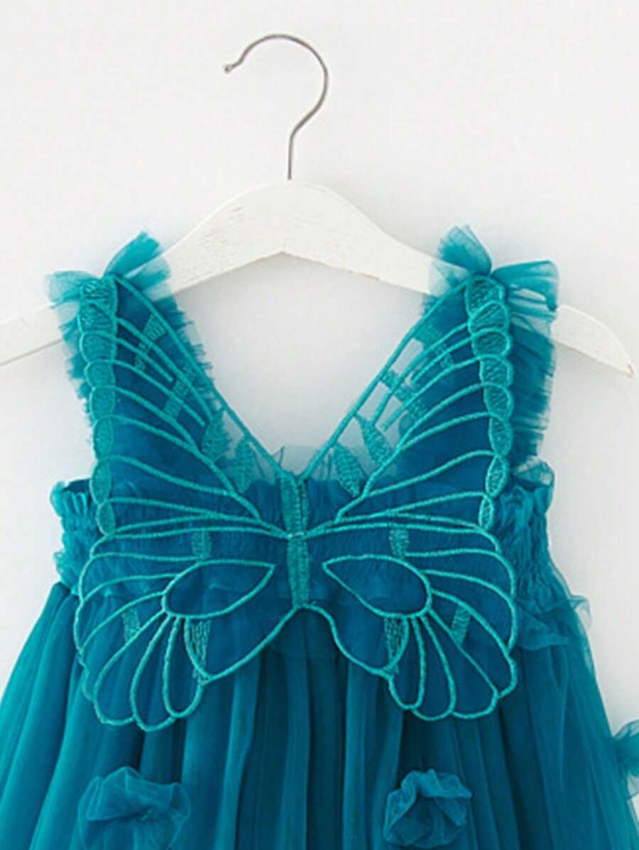 SHEIN Kids فستان أميرة شبكي للفتيات الصغيرات مزين بزهور وفراشات ثلاثية الأبعاد