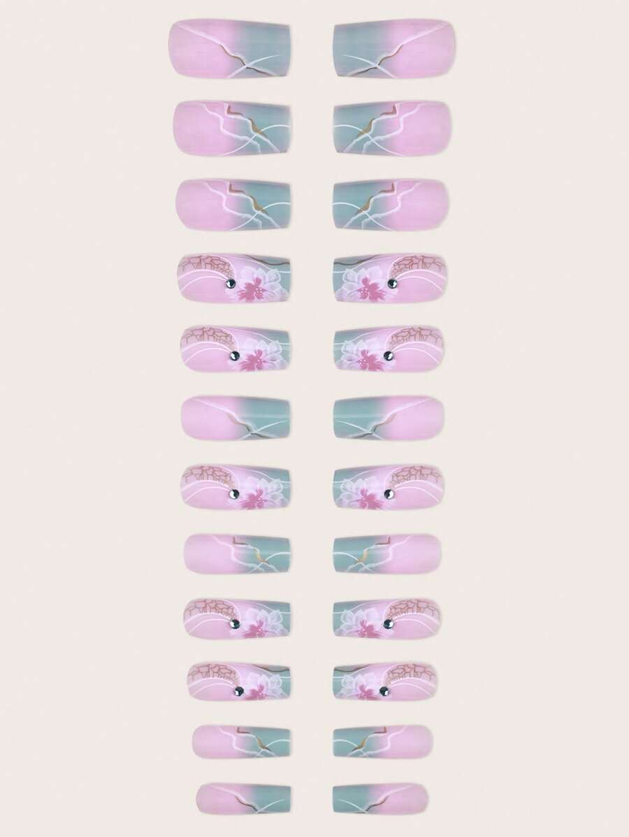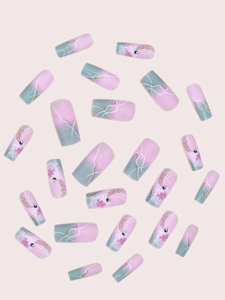 أظافر باليه باللون الوردي والأخضر المنعش متوسطة الحجم 24 قطعة + 1 قطعة من غراء ا