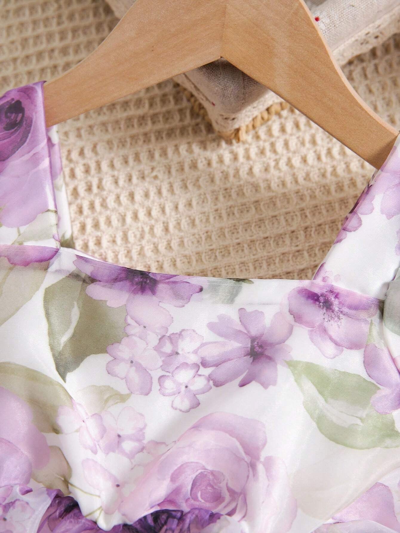 فستان قصير بأكمام فقاعية وطبعات الورد للأطفال الرضع بنات