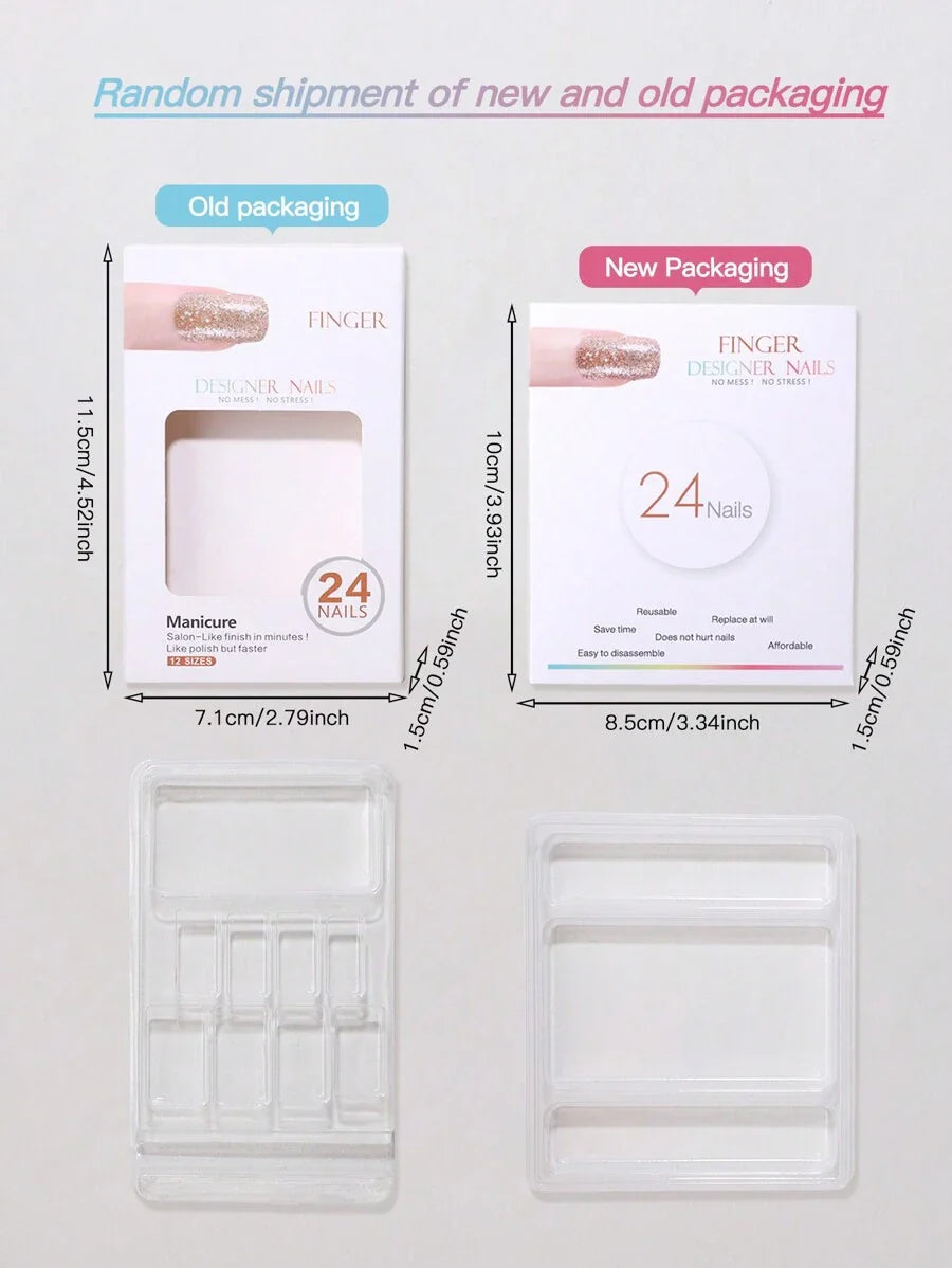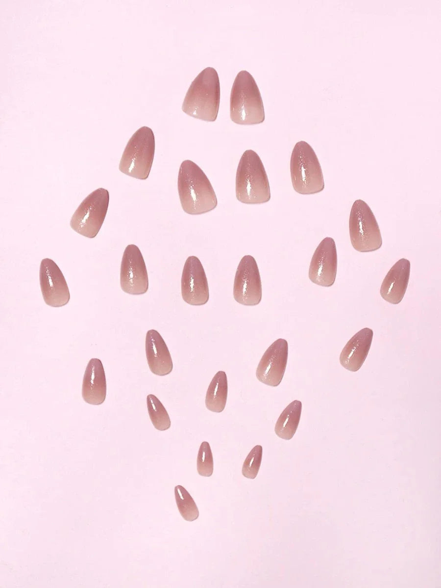 مجموعة أظافر شكلها أنيق وراقي، تجي بلون موحد ومنحدر يعطي لمسة ناعمة للإيدين، مع تأثير ورقة الشريط اللامعة. فيها خلط بين شكل اللوز والستيليتو، وقصيرة باش تكون مريحة وفي نفس الوقت ملفتة. تصميم ثلاثي الأبعاد يزيدها فخامة ويعطيك ستايل مرتب في ثواني!
